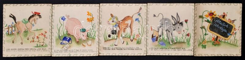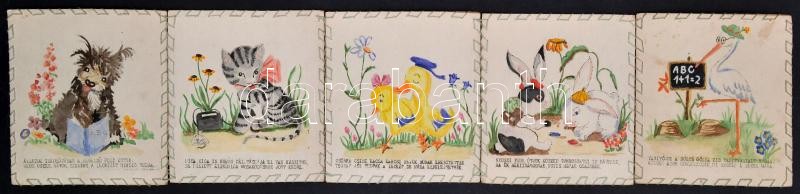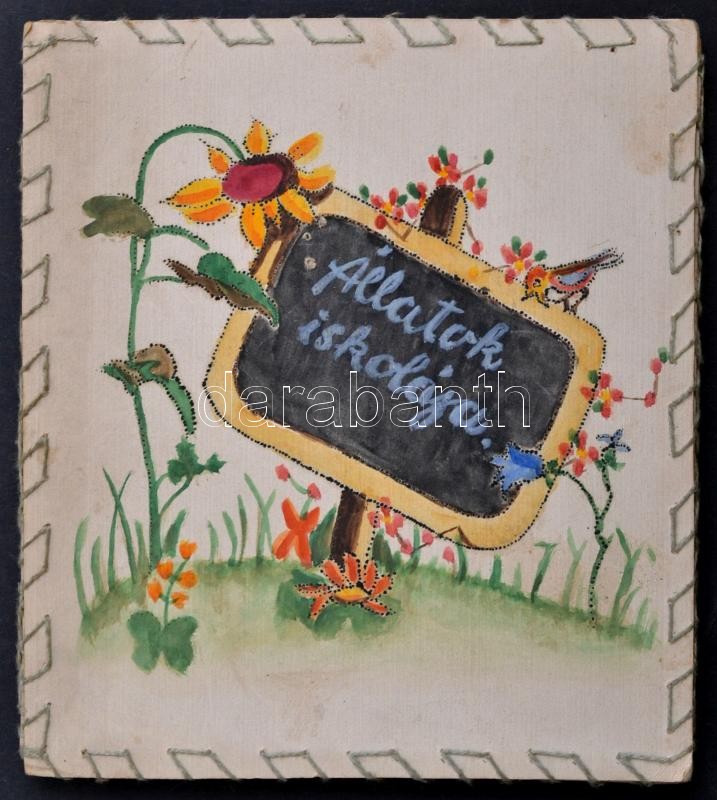cca 1940-1950 Állatok iskolája, kétoldalas amatőr gyerek kifestő, kézi fűzéssel, kézi rajzolással, utólagos színezéssel, festéssel, jelzés nélkül, 16,5x74,5 cm
