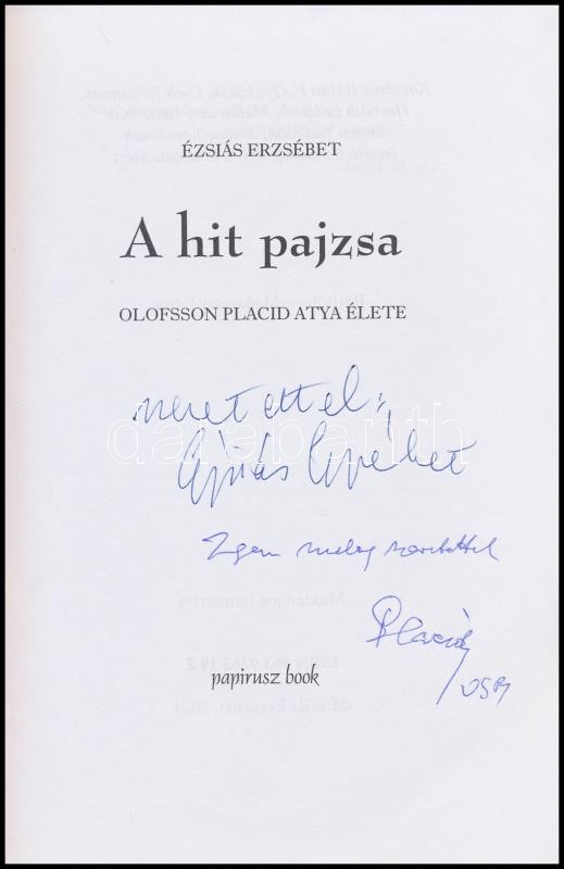 Description: Ézsaiás Erzsébet: A hit pajzsa. Olofsson Placid atya élete. Bp., 2004, Papirusz Book. 2. kiadás. Kiadói papírkötés. Placid atya (1917-2016) és Ézsaiás Erzsébet által dedikált példány.