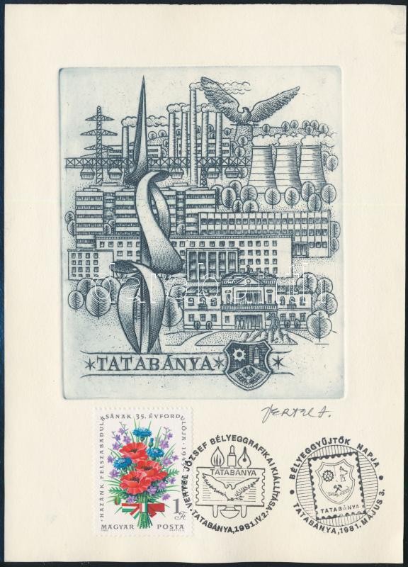 Vertel József (1922-1993): Tatabánya. Rézkarc, papír, jelzett, 10x11 cm. Alkalmi bélyegzéssel