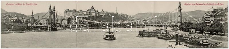 1903 Budapest, Erzsébet híd, kikötő hajókkal. Három részes kihajtható ...