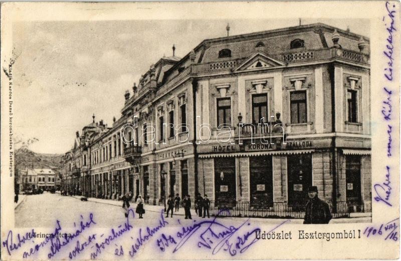 1906 Esztergom, Korona szálloda és Kávéház, Lőrincz utca. Kardos Dezső koronabazára kiadása