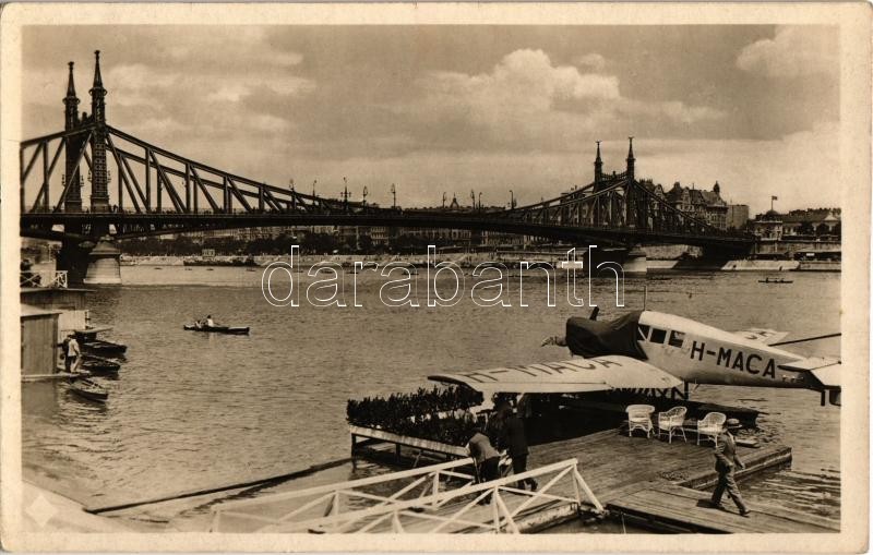Description: Budapest XI. Ferenc József híd, az Aeroexpress Rt. hidroplán állomása a Gellért Szálló előtt, H-MACA lajstromjelű Junkers F-13 típusú Budapest-Siófok járatú hidroplán