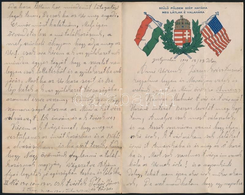 1909 Dekoratív magyar címeres, magyar-amerikai zászlós litografált fejlécű kivándorlási levélpapír Amerikából visszaküldött levélként, 4p