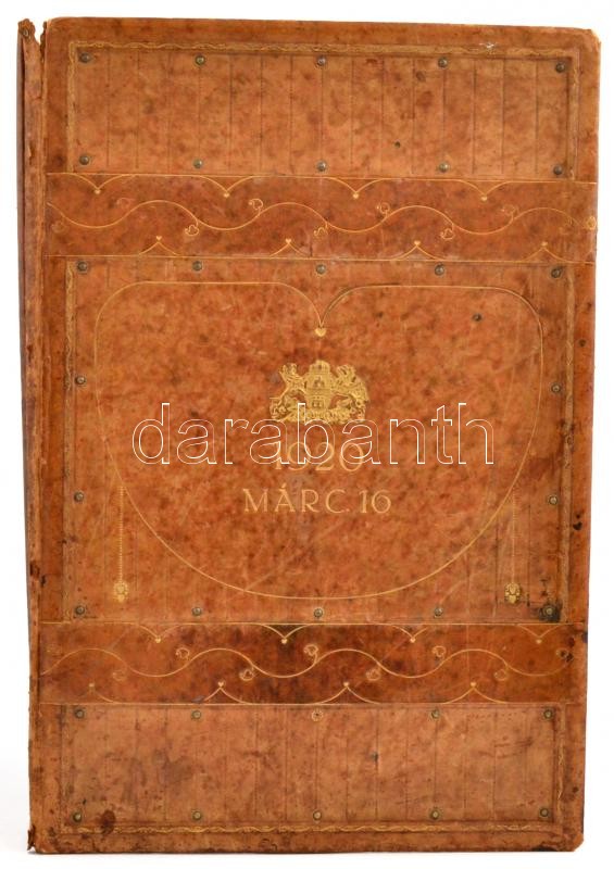 Description: 1920 Budapest címere és március 16. dátummal feltehetően Sipőcz Jenő főpolgármesterhez köthető közgyűlés emlékére. Aranyozott, rézveretes egészbőr. 34x50 cm Gerincnél sérült
