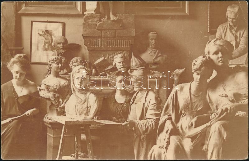 1955 kisfaludi Strobl Alajosné, Kratochwill Alojzia Lujza (1876-1964) saját kézzel írt levelezőlapja Keltscha Nándor hegedűművészhez, Stróbl műtermét ábrázoló fotón