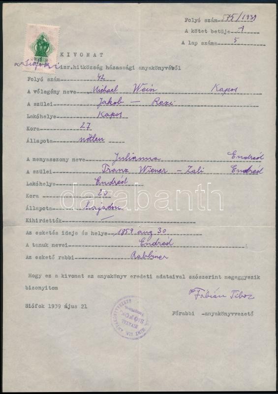 https://www.darabanth.com/en/347-Online-auction/347.0/Art-and-other-collectibles/Judaica~500024/1939-Siofok-hitkozsegi-hazassagi-anyakonyvi-kivonat-okmanybelyeggel-a-Fabian-Tibor-sio~II1972049