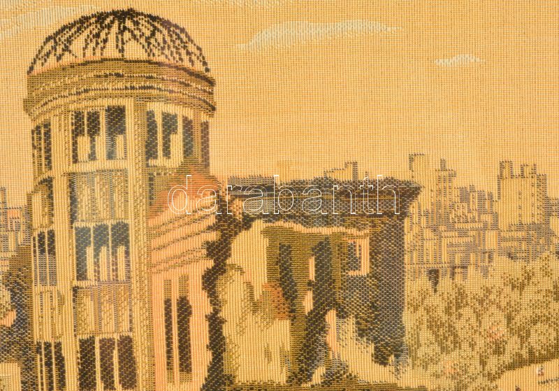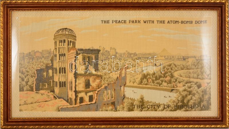 cca 1960 Nagaszaki az Emlékpark az atombomba dómmal. Nagyméretű gobelin, Ajándék a Bara-Gyarmati házaspár részére. Üvegezett keretben. 85x45 cm