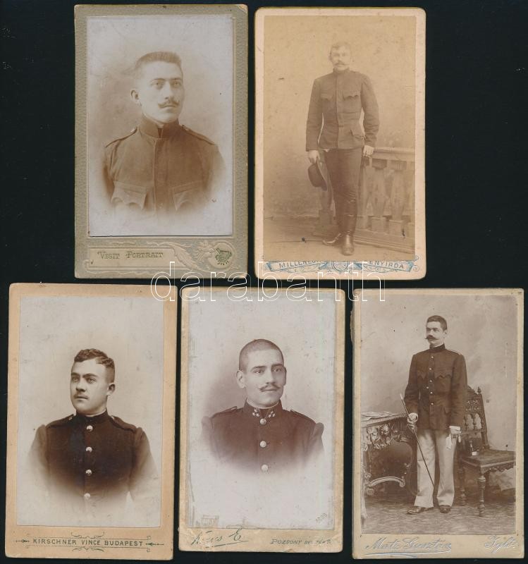 cca 1900 Katonaportrék, 5 db keményhátú fotó különféle műtermekből (Pozsony, Igló, Budapest), egy részük hátulján feliratozva, különböző méretben
