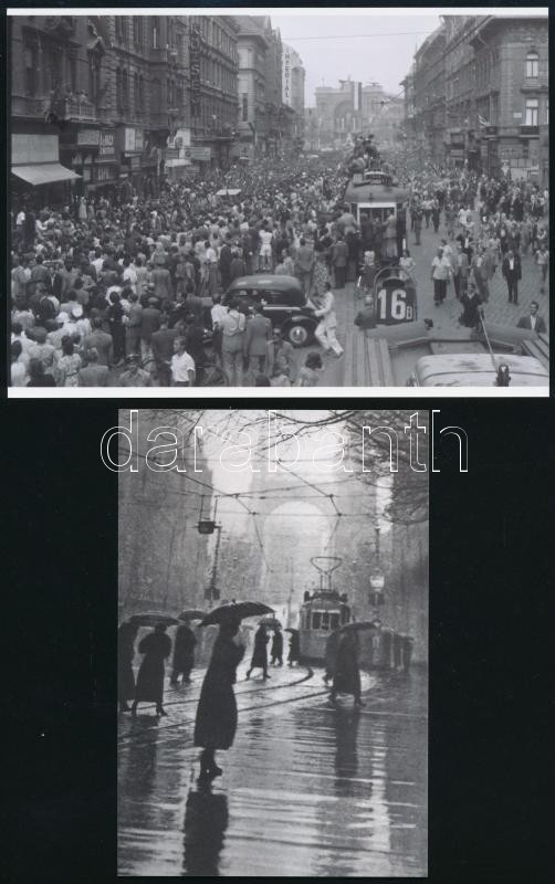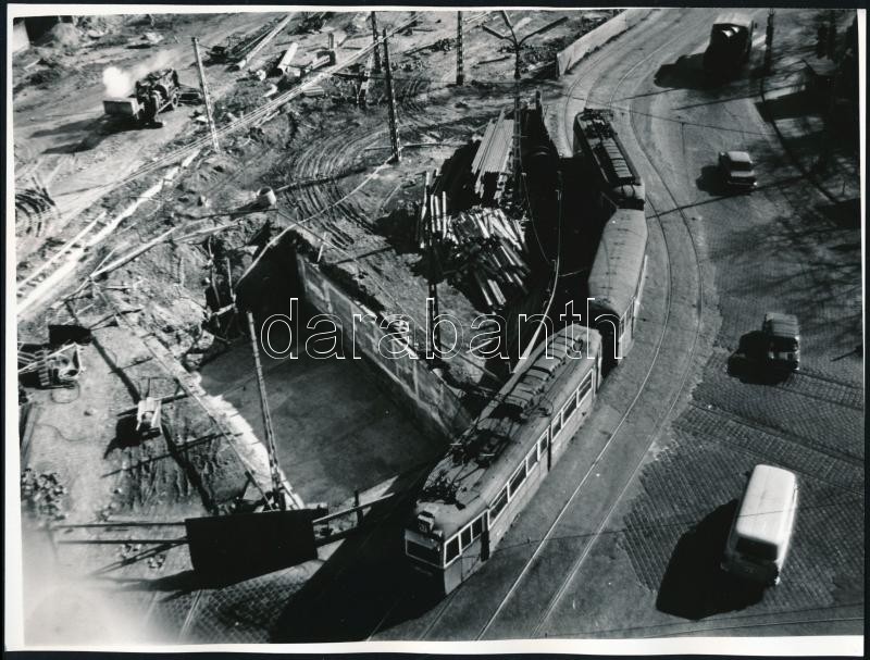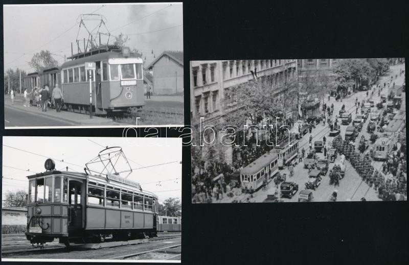 cca 1975 Budapest, 52-es villamos felülnézetben, vintage fotó, 18x24 cm + Villamosok tétele, 5 db mai nagyítás, 9x12,5 cm és 13x18 cm között + 1992. november 6. Budapest, síncsiszoló szerelvény a BKV-nál, 31 db szabadon felhasználható vintage negatív, 24x36 mm