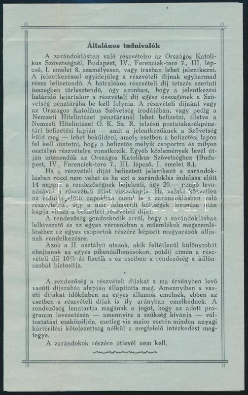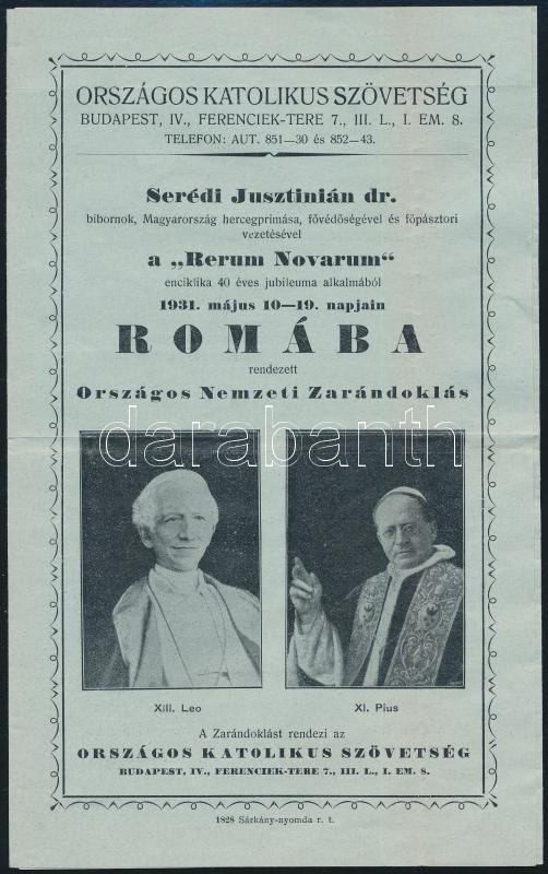 Description: 1931 Országos nemzeti zarándoklat Rómába a Rerum novarum enciklika 40 éves jubileumára Serédi Jusztinián szervezésében, az országos Katolikus Szövetség ismertető röplapja