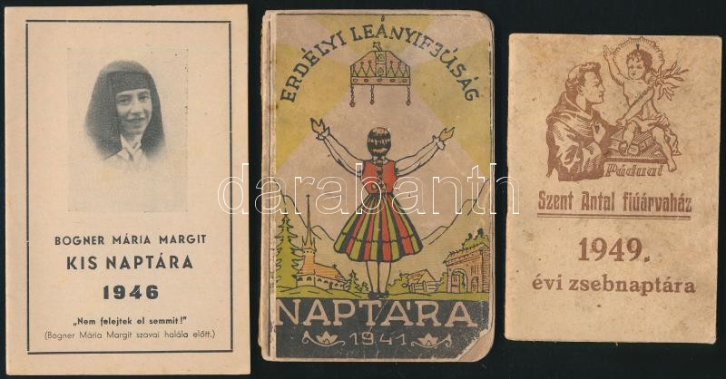 Description: 1941-1949 Erdélyi leányifjúság naptára. 1941. Kolozsvár, Minerva, 88 p. Kiadói illusztrált papírkötésben, kopott, foltos borítóval, bejegyzésekkel.+1946 Bogner Mária Margit kis naptára. 1946.+1949 Szent Antal fiúárvaház zsebnaptára. 1949