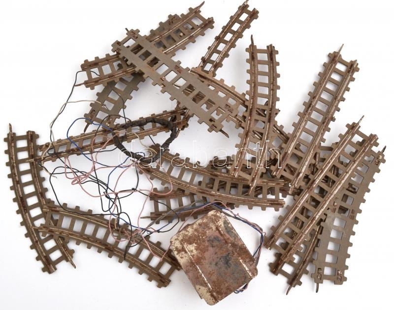 Régi játékvasút elemek, sínek, 1 db mozdony, 2 db kocsi