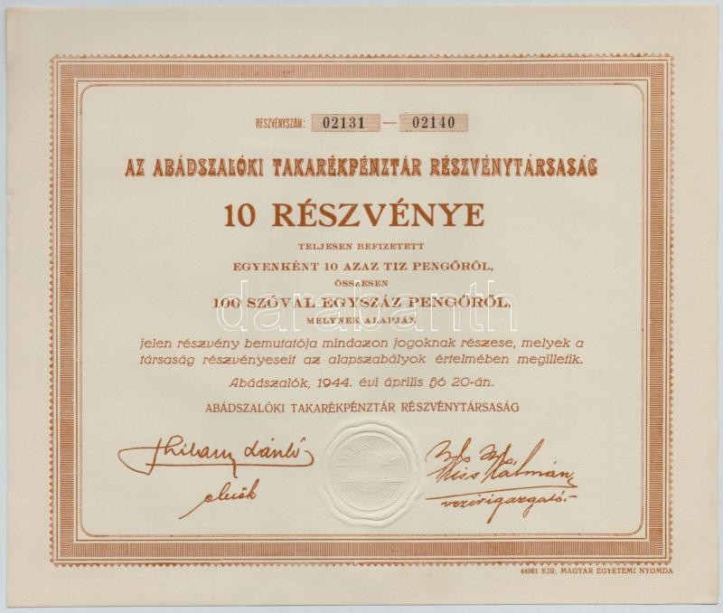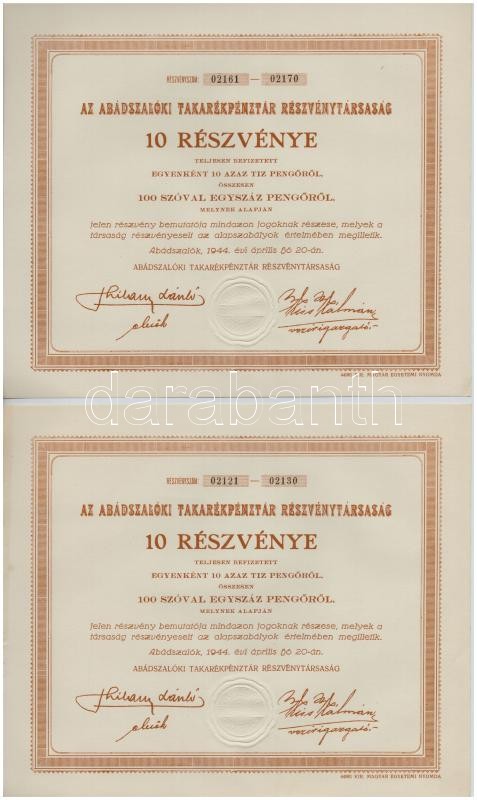 https://www.darabanth.com/en/347-Online-auction/347.0/Numismatics/Shares-and-Tickets~1000004/Abadszalok-1944-Abadszaloki-Takarekpenztar-Reszvenytarsasag-10db-reszvenye-egyben-C3~II1956468