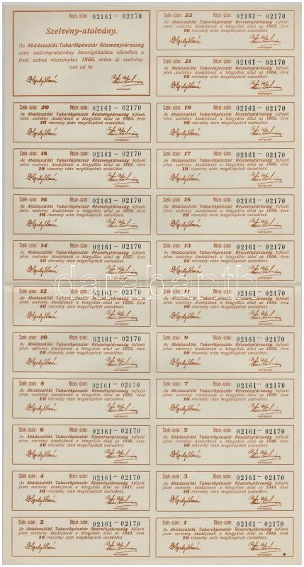Abádszalók 1944. "Abádszalóki Takarékpénztár Részvénytársaság" 10db részvénye egyben, összesen 100P-ről (3x) sorszámkövetők, szárazpecséttel, szelvényekkel T:I-