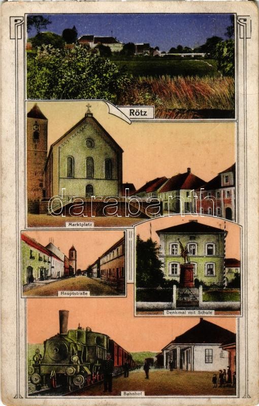 Rötz, Marktplatz, Hauptstraße, Denkmal mit Schule, Bahnhof / market square, main street, military monument, school, railway station, locomotive, railwaymen (EK)