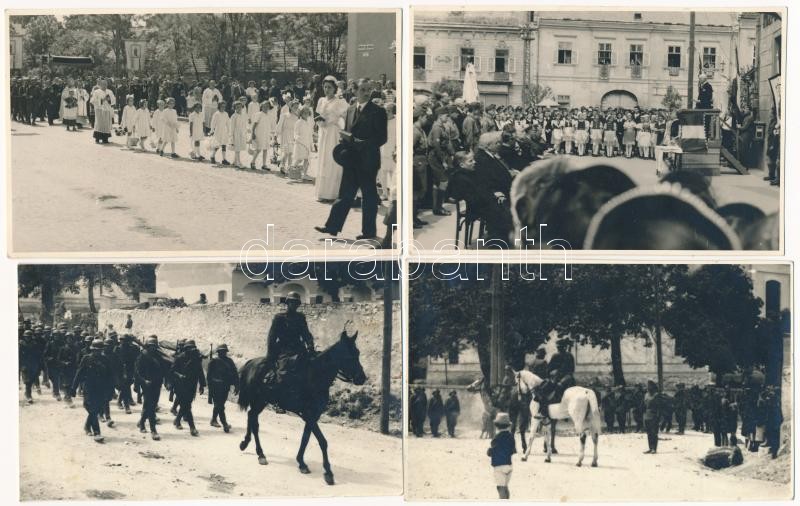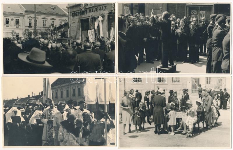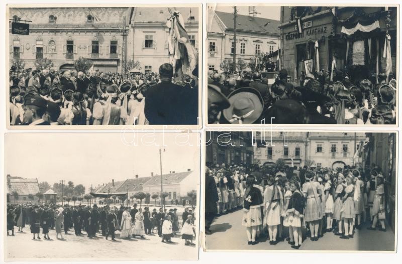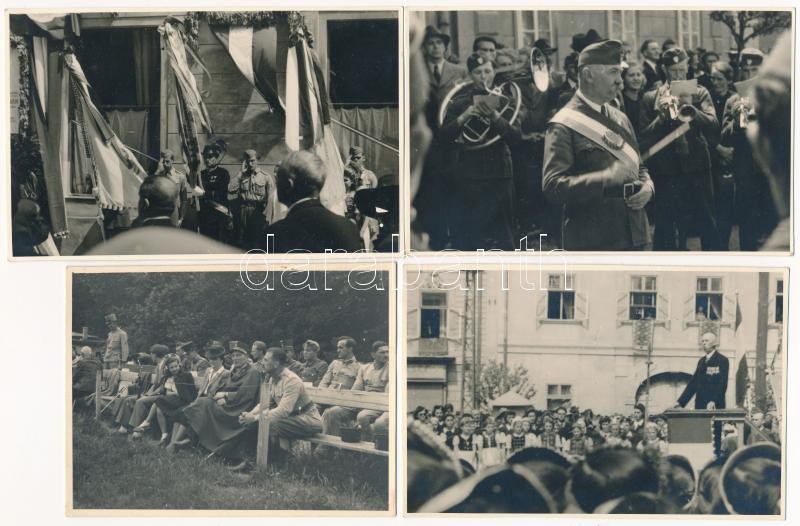 1942 Május 17. Magyaróvár, Mosonmagyaróvár; gr. Széchenyi István születésének 150. évfordulójára készült emléktábla átadási ünnepsége a Központi Kávéház előtt. Vitéz dr. Bittera Miklós akadémiai és egyetemi tanár, gazdasági főtanácsos, felsőházi és megyebizottsági tag ünnepi beszéde, Albrecht főherceg, Antal miniszter, főispán, alispán, akadémiaigazgató és tanárok, felsőházi tagok, honvéd helyőrségparancsnok, Győr város polgármestere, országgyűlési képviselők, lelkészek, aktív és nyugalmazott tisztviselők, gyárigazgatók, földbirtokosok, dr. Schmack Leó magyaróvári járási főszolgabíró, leventék, a cserkészek, a tűzoltók, a dalárdák, a zenekarok. Ünnepi avatóbeszédet dr. Kühne Lóránt gyárigazgató tartotta, Finta Sándor szavalt. Utolsónak dr. Antal István nemzetvédelmi és propagandaminiszter beszélt. Vida Ferenc fényképész felvételei - 27 db eredeti fotó felvétel, beragasztás nyomai a hátoldalakon