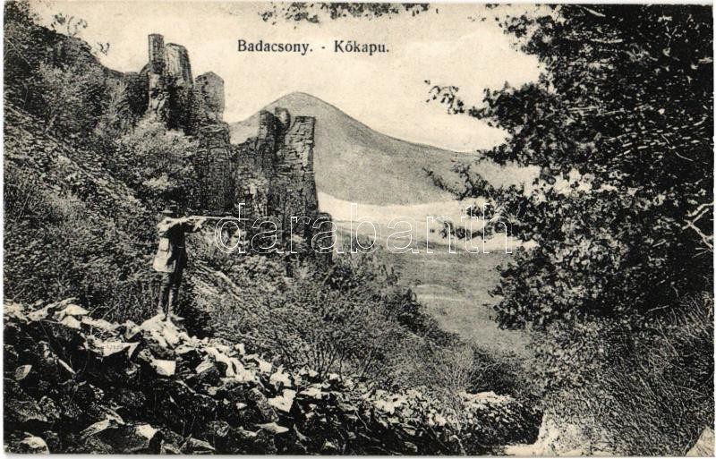 Badacsony, Kőkapu, vadász puskával. Mérei Ignác kiadása