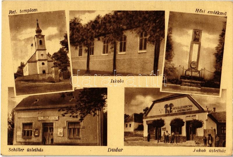Dudar, Református templom, Iskola, Hősi emlékmű, Schiller Józsefné üzl... https://www.darabanth.com/en/347-Online-auction/347.0/Postcards/Hungary~2500005/Dudar-Reformatus-templom-Iskola-Hosi-emlekmu-Schiller-Jozsefne-uzlete-Jakab-uzlethaz-~II1971770
