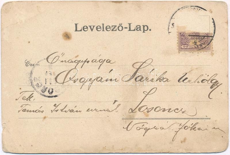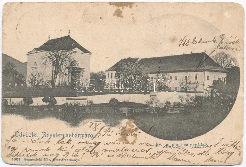 Description: 1901 Besztercebánya, Banská Bystrica; Evangélikus templom és paplak, lelkészlak. Kiadja Sonnenfeld Mór / Lutheran church and parsonage (ázott / wet damage)
