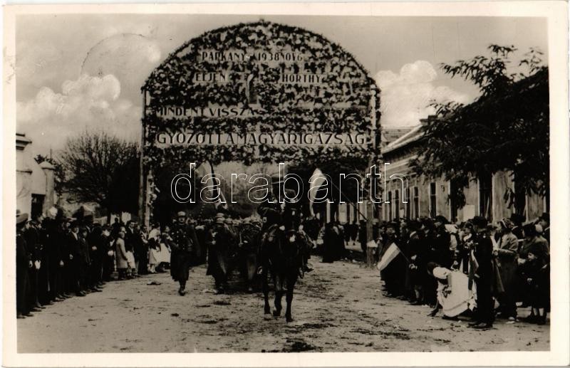 1938 Párkány, Stúrovo; bevonulás, díszkapu, magyar zászló / entry of t...