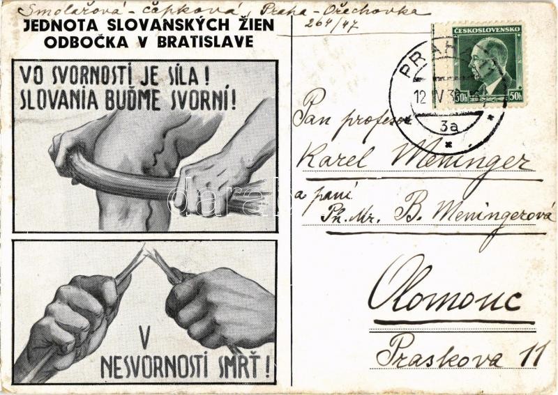 Description: 1938 Pozsony, Pressburg, Bratislava; Szláv Nők Egysége propagandalap / Jednota Slovanskych Zien Odbocka v Bratislave, Vo Svornosti je sila! Slovania Budme Svorní! V Nesvornosti smrt! / The Unity of the Slavonic Women propaganda (EK)