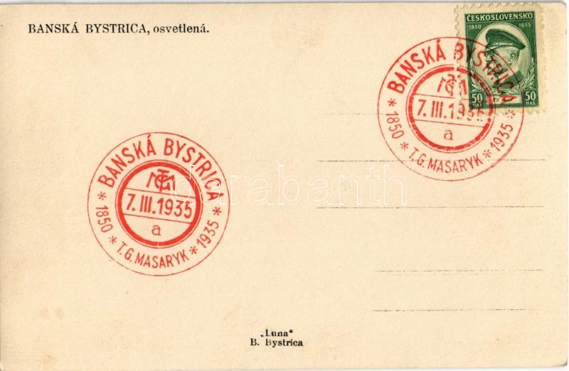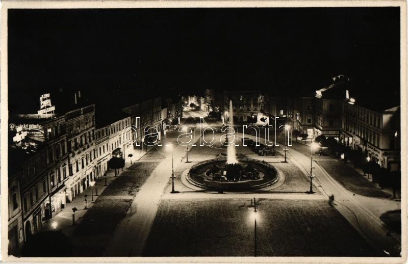 Besztercebánya, Banská Bystrica; osvetlená / tér éjjeli kivilágításban, Pilsner Urquell (Plzensky prazdroj) reklám, automobilok, Alois Fischer, Bárczy Oszkár üzlete, szökőkút / square at night, shops, Plzen brewery advertising poster on the wall, automobiles, fountain + 1850-1935 Banská Bystrica T. G. Masaryk (85th birthday anniversary) So. Stpl.
