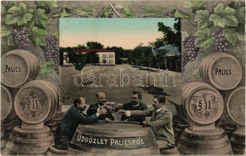 1911 Palics, Palic (Szabadka, Subotica); Montázs boros hordókkal, szőlőkkel, italozó urakkal. Kiadja Vig Zsigmond Sándor / Montage postcard with grapes, barrels, men drinking wine