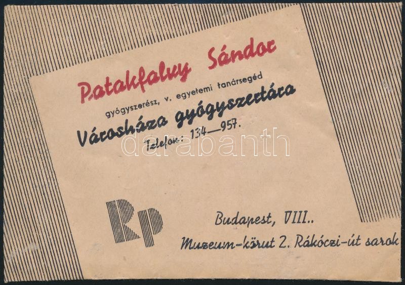 Patakfalvy Sándor Városháza Gyógyszertár receptborítékja (Bp. Múzeum körút 2. Rákóczi úti sarok)
