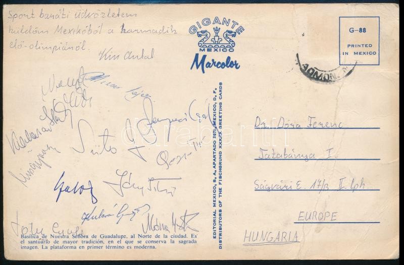 1968 Olimpikonok aláírásai a mexikói előolimpiáról küldött levelezőlapon (Pézsa, Fenyvesi, Németh, stb.)