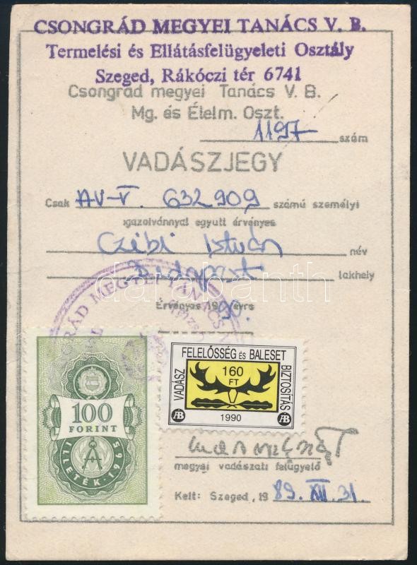 1989 a Csongrád Megyei Tanács által kiállított éves vadászjegy az 1990. évre, 2 db okmánybélyeggel