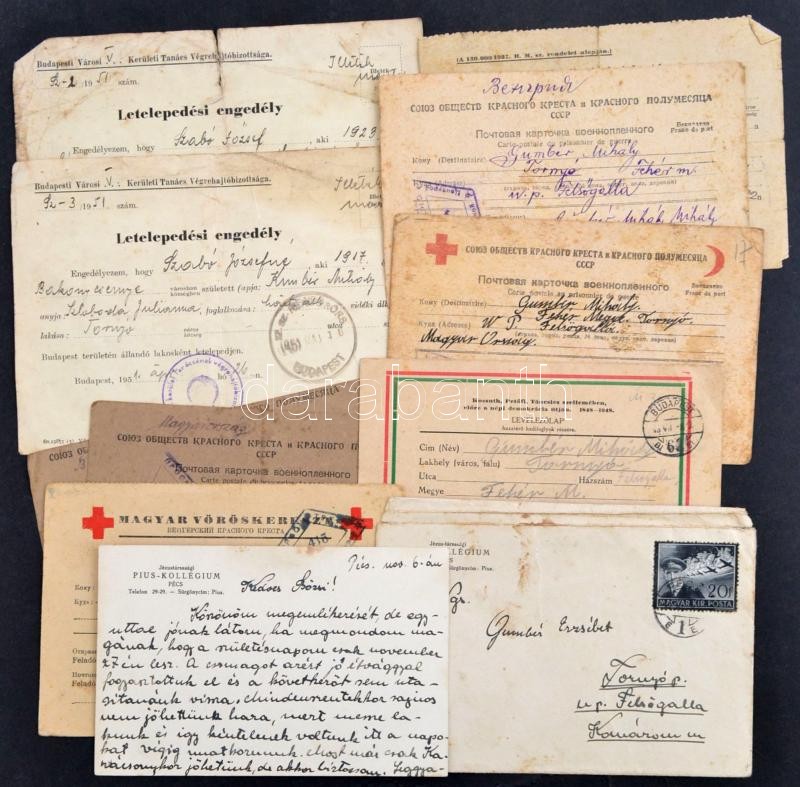 1942-1948 Vegyes papírrégiség tétel, közte 6 db hadifogoly levelező lappal (1 db Magyar Vöröskereszt, a többi szovjet), Magyar Dolgozók Pártja (MDP) hadifogoly levelezőlappal, valamint Pécs, Jézustársasági Pius-Kollégiumos levelezőlappal, borítékkal, valamint 2 db letelepedési engedéllyel, kerékpár-bejelentéssel, részben egy család/személyhez köthetőek, összesen 11 db.