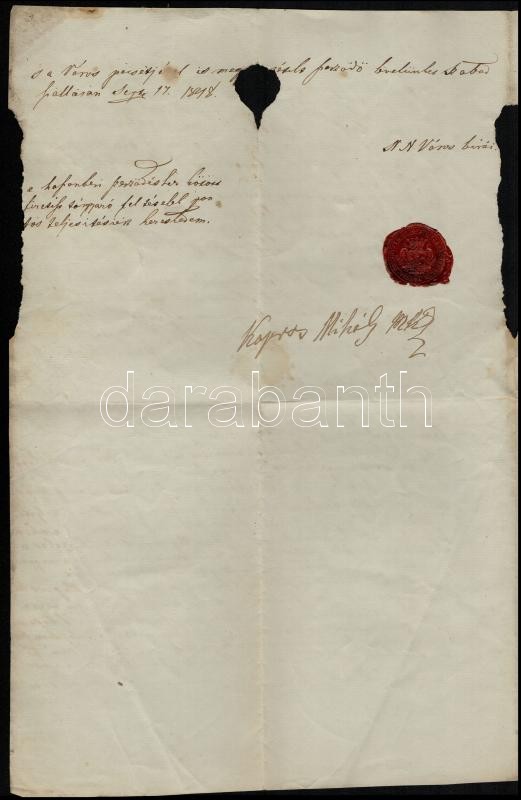 1848 Kiskunszabadszállás város szerződése a ja városi fogadó bérletéről. A városi elöljárók aláírásával és a város címeres pecsétjével. Kis hiánnyal.