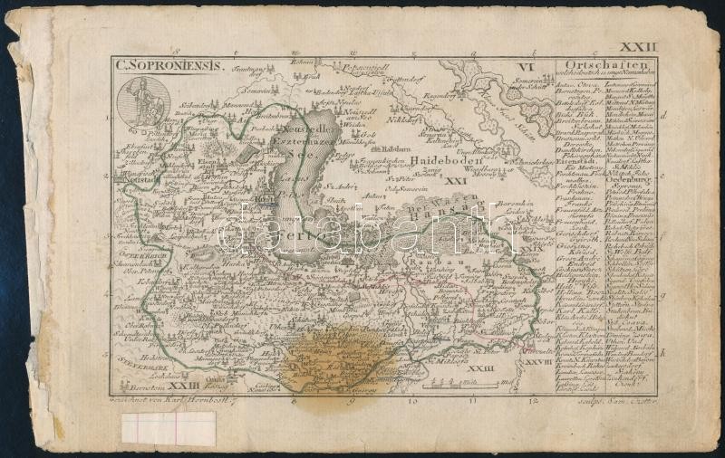 1804 Karl Hornbostl (?-?) - Czetter Sámuel (1765-1829 k.): Sopron vármegye térképe. C(Comitatus) Soproniensis. XXII. In: [Korabinszky János Mátyás]: Korabinsky, Johann Matthias: Atlas Regni Hungariae Portatilis. Bécs, 1804. Schaumburg und Compagnie, rézmetszet, javított, foltos, 10x17 cm./ 1804 Karl Hornbostl (?-?) - Samuel Czetter (1765-1829 cca.):Map of Sopron County. C(Comitatus) Soproniensis. XXII. In: Korabinsky, Johann Matthias: Atlas Regni Hungariae Portatilis. Wien, 1804. Schaumburg und Compagnie, copper engraving, repaired, spotty, 10x17 cm