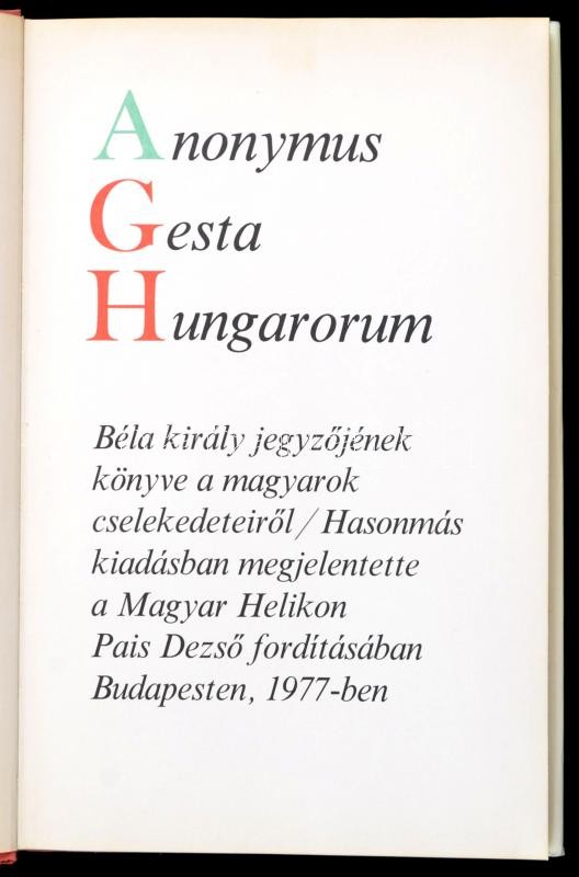 Anonymus: Gesta Hungarorum. Béla király jegyzÅ‘jének könyve a magyarok cselekedeteirÅ‘l. Bp., 1977, Magyar Helikon. Hasonmás kiadás, fordÃtással. Kartonált papÃrkötésben, papÃr védÅ‘borÃtóval, jó állapotban.