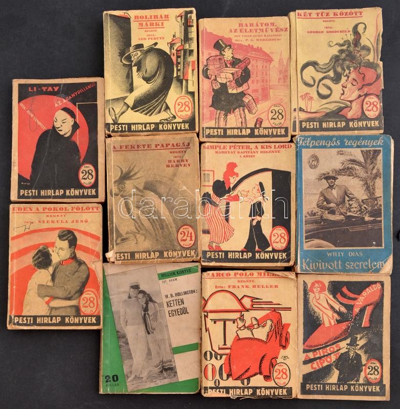 Pesti Hírlap könyvek sorozat 9 kötete. Bp., 1927-1929, Légrády-ny. Kiadói papírkötésben, közte egy töredék kötettel, változó állapotban, közte szakadt borítókkal, egy könyvtest elvált a borítótól.+1-1 kötet a Milliók könyve, és Félpengős regények, az utóbbi borítója szakadozott.