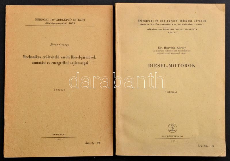 Dr. Horváth Károly: Diesel-motorok. Bp.,1964, Tankönyvkiadó. Kiadói papírkötés. Megjelent 260 példányban. +Jávor György: Mechanikus erőátvitelő vasúti Diesel-járművek vontatási és energetikai sajátosságai. Bp., 1962, Mérnöki Továbbképző Intézet. Kiadói papírkötésben. Megjelent 300 példányban.