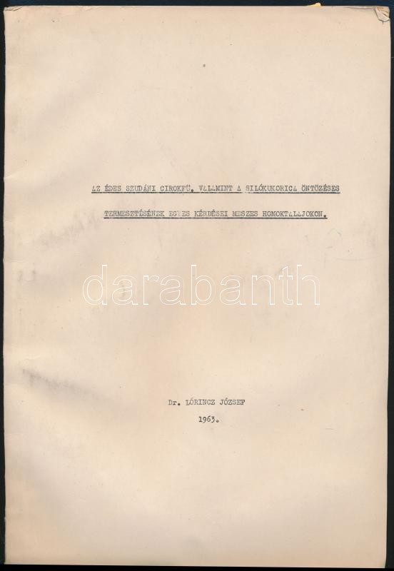 Dr. LÅ‘rincz József: Az édes szudáni cirokfű, valamint a silókukorica öntözéses termesztésének egyes kérdései meszes homoktalajon. hn.,1963, nyn. PapÃrkötésben. Az összefoglalás végén a szerzÅ‘ aláÃrásával.