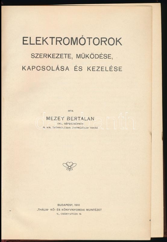Mezey Bertalan: Elektromótorok szerkezete, működése, kapcsolása és kezelése. Bp., 1910, Thália Kő- és Nyomdai Műintézet, 220+XXIV p. Korabeli reklámokkal. Kiadói egészvászon-kötés, kissé kopott borítóval, a gerincen címkével, és sérüléssel.