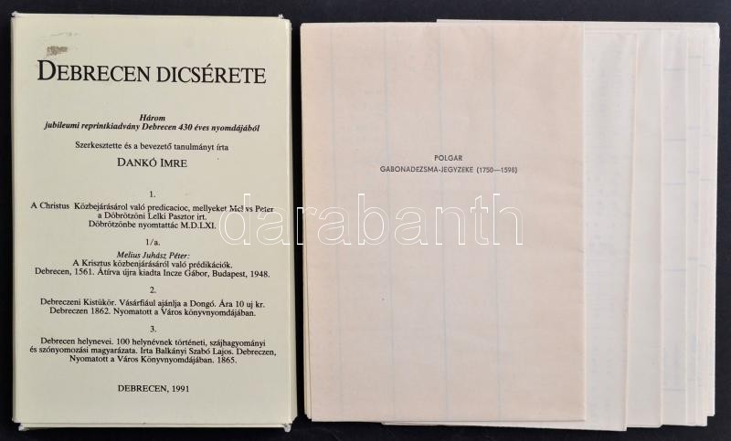 Description: Balkányi Szabó Lajos, Melius Péter: Debrecen dícsérete. A Christus Közbejárásárol való predicacioc; A Krisztus közbenjárásáról való prédikációk; Cebreczeni Kistükör; Debrecen helynevei. Debrecen, 1991. Reprint kiadványok papírtokban