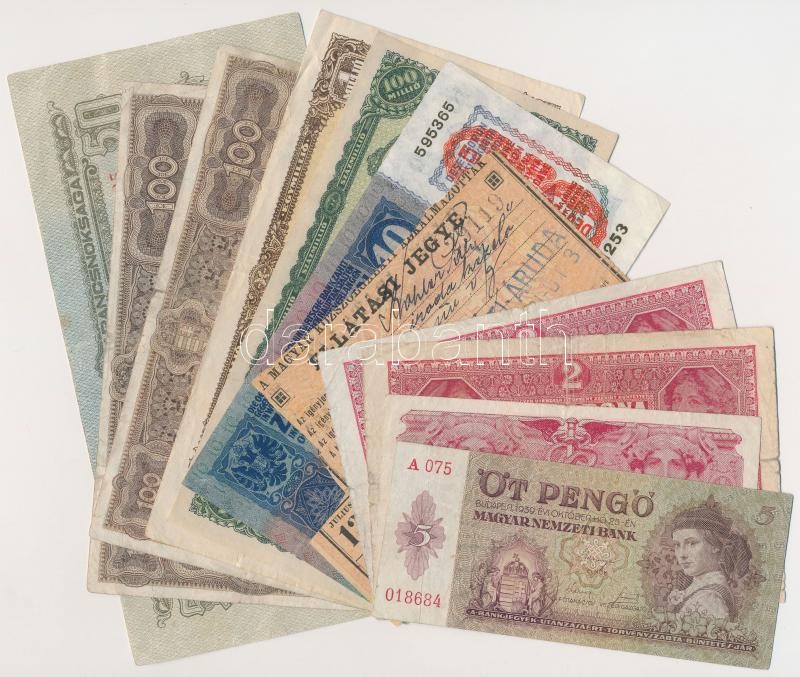 Description: Vegyes 12db-os korona, pengő tétel, közte "A Magyar Közszolgálati Alkalmazottak" névre szóló ellátási jegye, rajta "Magy. kir. államvasutak budapesti üzletvezetőségének számosztála" és "Keleti Áruda - Kerepesi-út 3" bélyegzések T:III