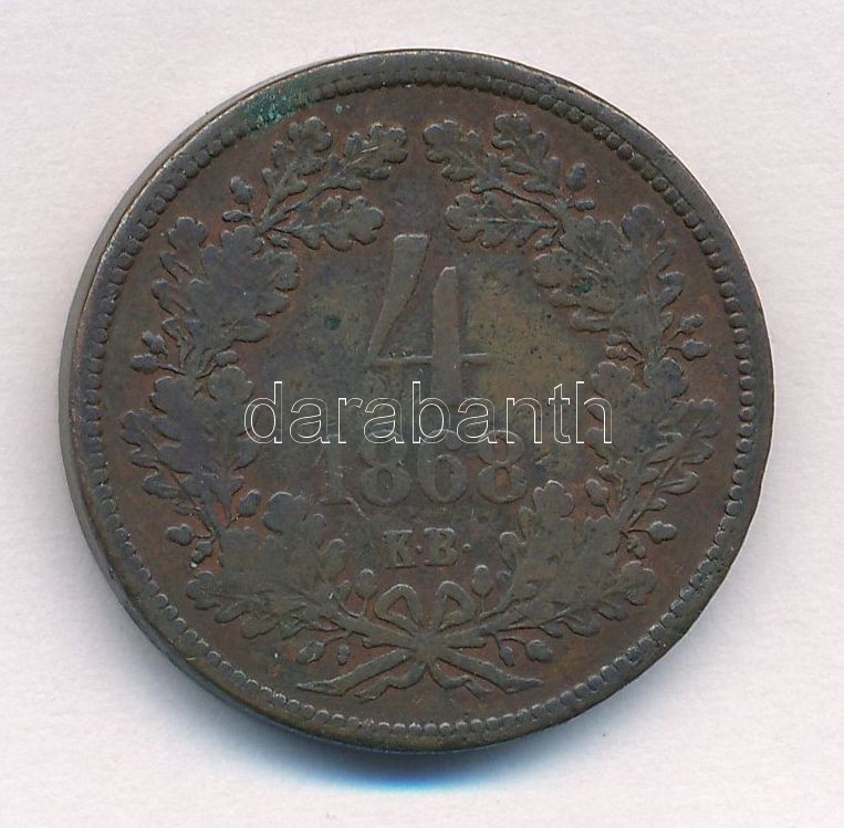 https://www.darabanth.com/en/349-Online-auction/349.0/Numismatics/Hungarian-coins-and-coins-with-Hungarian-mint-marks~1000007/1868KB-4kr-Cu-T3-kis-patina--Adamo-M71~II1982583