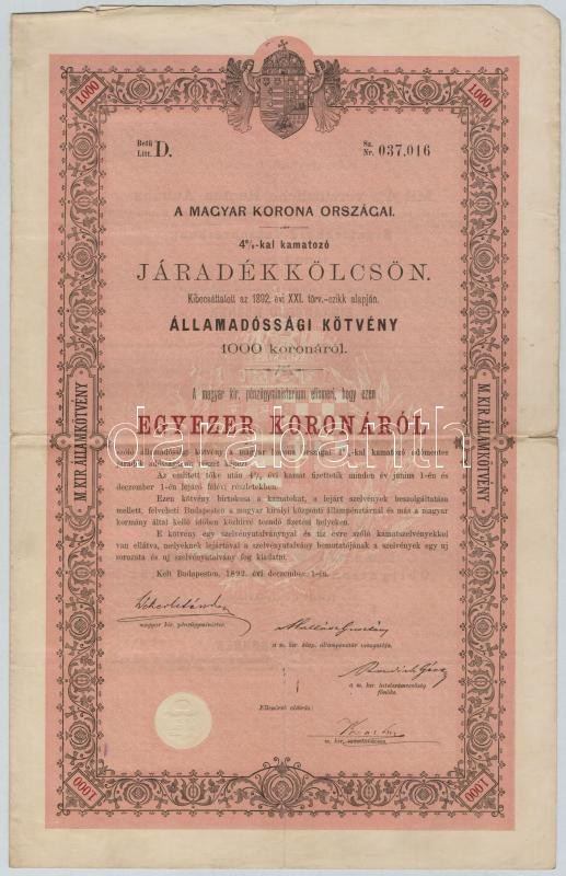 Budapest 1892. "A Magyar Korona országai 4%-al kamatozó járadékkö... https://www.darabanth.com/en/349-Online-auction/349.0/Numismatics/Shares-and-Tickets~1000004/Budapest-1892-A-Magyar-Korona-orszagai-4-al-kamatozo-jaradekkolcson-allamadossagi-kotv~II1980878