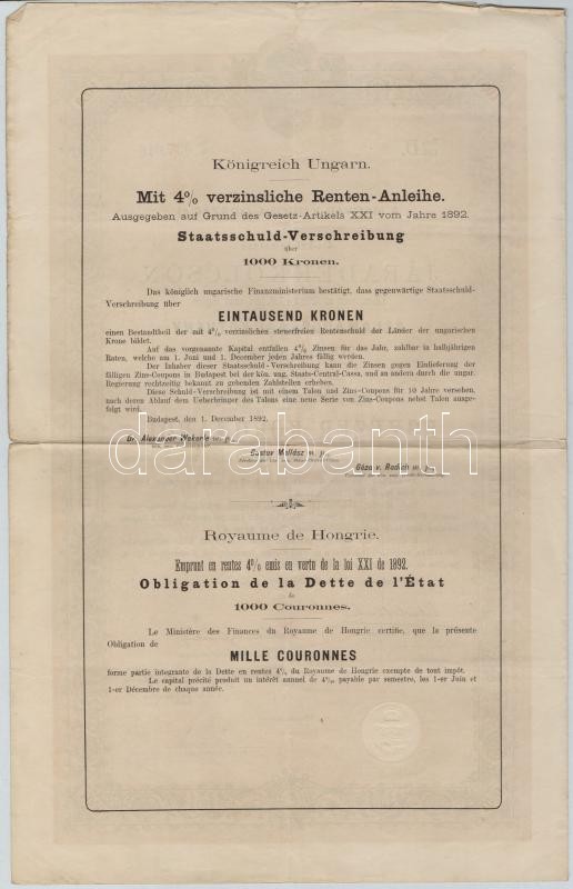 Description: Budapest 1892. "A Magyar Korona országai 4%-al kamatozó járadékkölcsön" államadóssági kötvény 1000K-ról, szárazpecséttel, bélyegzéssel, szelvényekkel T:III szakadás