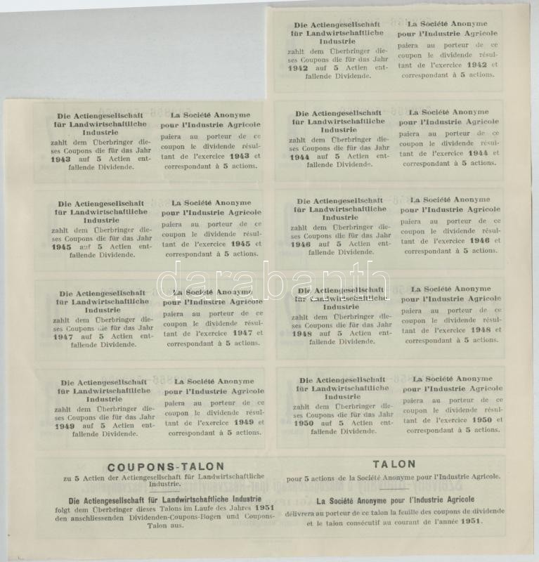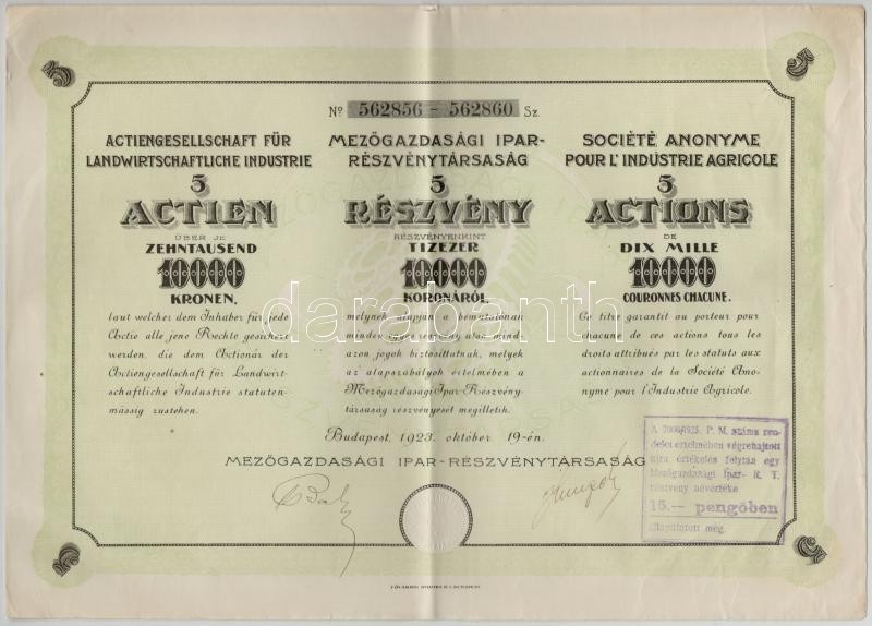 Description: Budapest 1926. "Magyar Általános Kőszénbánya Részvénytársulat" tíz darab részvénye egyenként 200P-ről, két nyelvű, szárazpecséttel és bélyegzéssel + Budapest 1923. "Mezőgazdasági Ipar-Részvénytársaság" részvénye 10.000K-ról, három nyelven, szárazpecséttel, bélyegzéssel és szelvényekkel T:III,III-