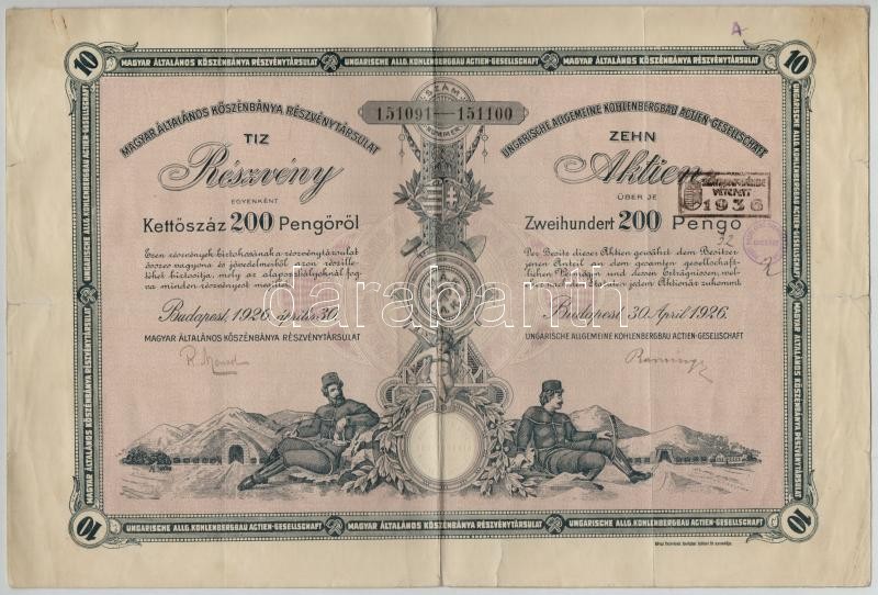 Budapest 1926. "Magyar Általános Kőszénbánya Részvénytársulat&quo... https://www.darabanth.com/en/349-Online-auction/349.0/Numismatics/Shares-and-Tickets~1000004/Budapest-1926-Magyar-Altalanos-Koszenbanya-Reszvenytarsulat-tiz-darab-reszvenye-egyenk~II1982426