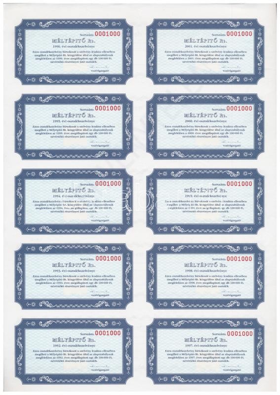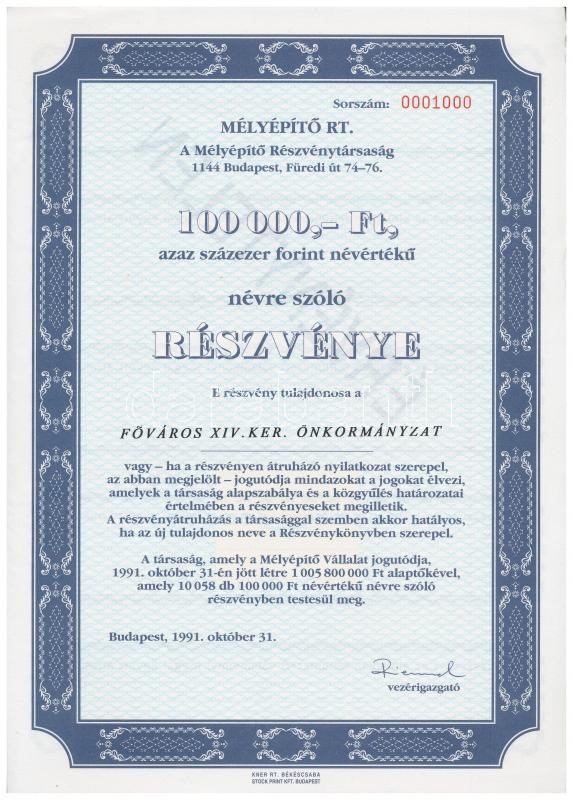 Budapest 1991. "Mélyépítő RT. " névre szóló részvénye 100.000Ft-ról, szelvényekkel, belső oldalon "ÉRVÉNYTELEN" felülbélyegzéssel T:I,I-