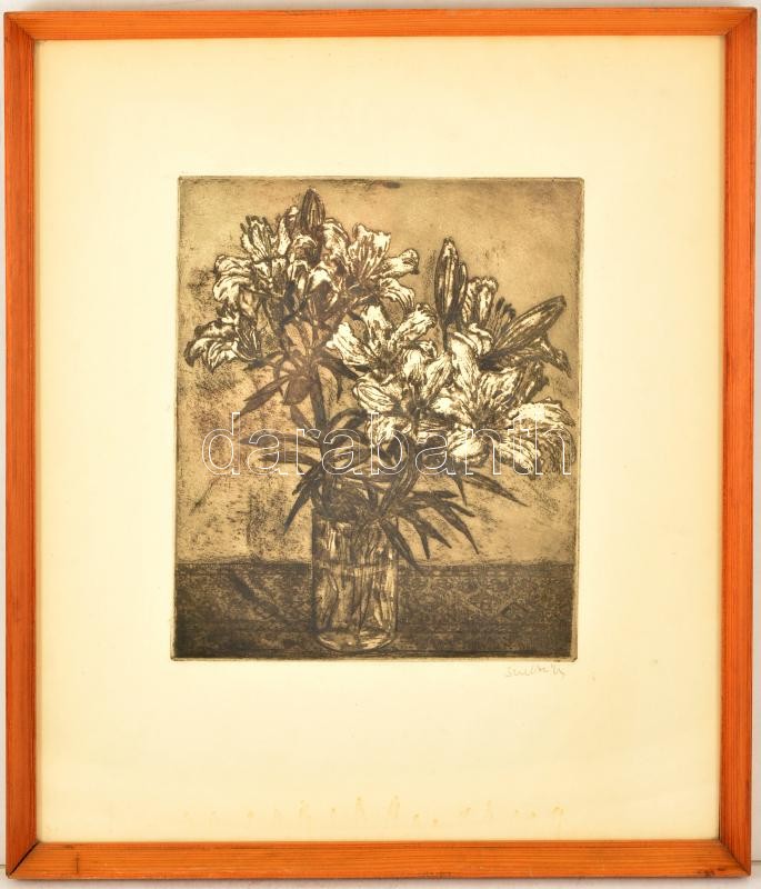 Scultéty Éva (1917-2001): Virág csendélet, rézkarc, papír, jelzett, üv...
