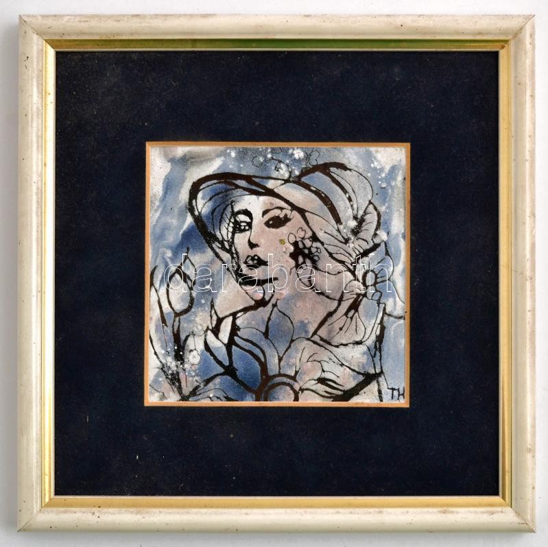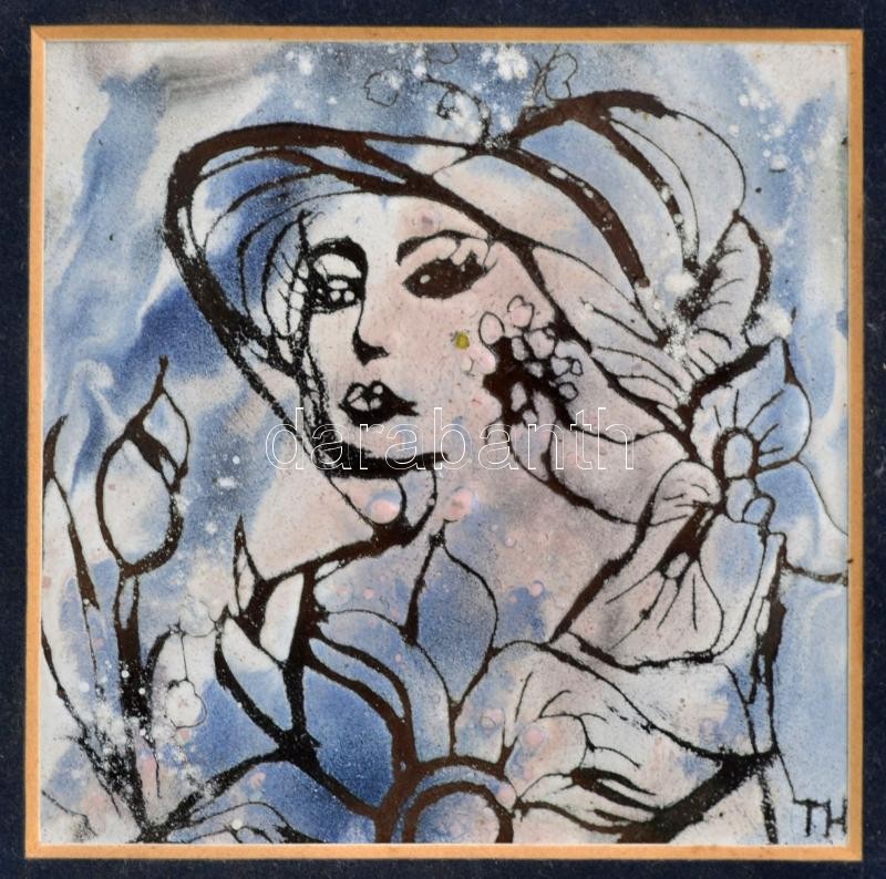 Szabóné Tóth Hilda (?-?): Női portré. Tűzzománc, rézlemez, jelzett, f...