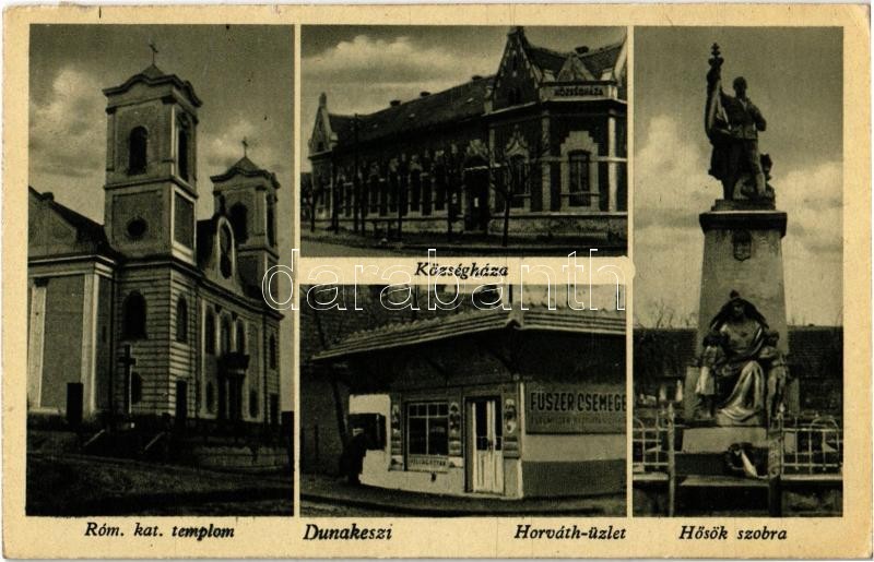 Dunakeszi, Római katolikus templom, Községháza, Hősök szobra, emlékmű, Horváth üzlete és saját kiadása (EK)