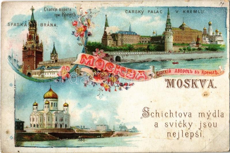 Moscow, Moskau, Moscou; Spaská Brána, Carsky Palác v Kremlu / Saviour (Spasskaya) Gate and Tower, Kremlin, Cathedral of Christ the Saviour. Schicht's soap factory advertisement. Art Nouveau, floral, litho (glue mark)